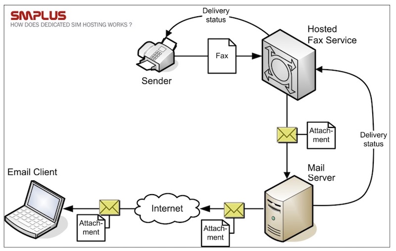 The processed file is then transmitted to the Web server, which sends it as an email containing the fax as an attached file, and sometimes sends a message reporting delivery to a mobile phone (optional).